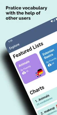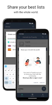Make vocabulary lists and practice them! Depending on the learning success, the vocabulary is sorted into different levels until they reach the maximum level and are learned. If your lists are special, you can share them with the community around the world. Other users can view and download them to find and learn new words quickly and flexibly. In return, you will also receive lists that interest you. This feature makes Fluently special: instead of searching for words and creating lists yourself, you can exchange your lists with other users directly in the app.